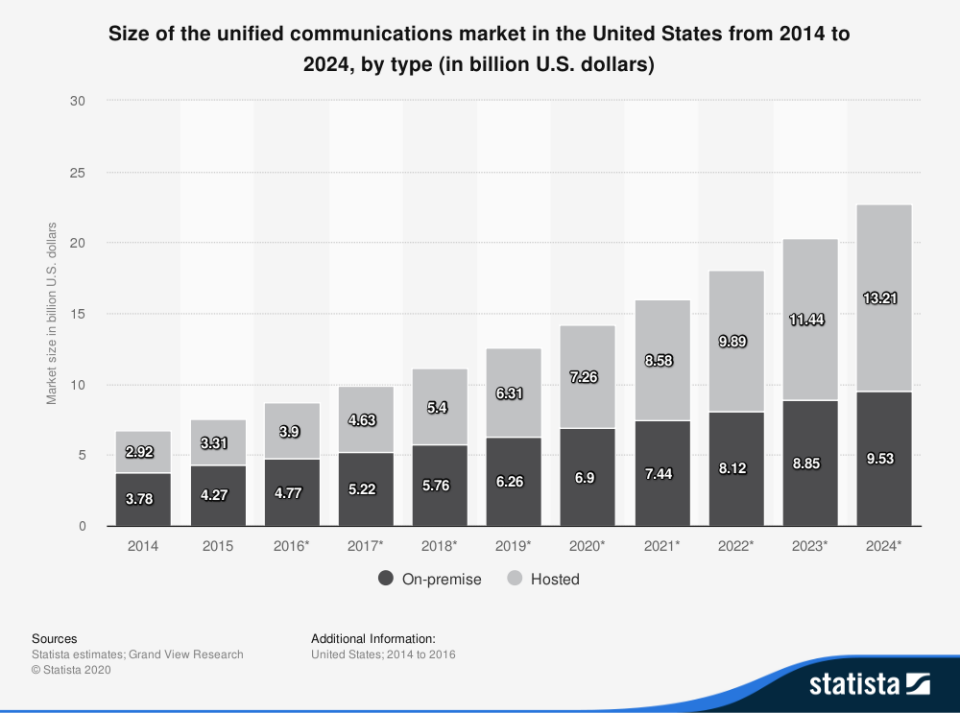 According to Statista data shown in the chart below, the UCaaS market is expanding. The trend indicates that most customers are expected to opt for hosted or managed solutions in the coming years.
